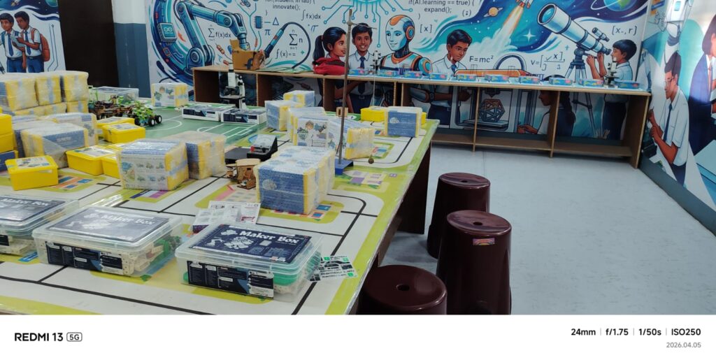 The setup includes advanced robotics kits, AI modules, IoT boards, 3D printers, coding stations, and structured learning content for both students and teachers.